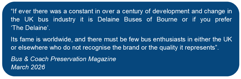 The sight of the familiar blue and cream buses now dates back beyond living memory and the Delaine brand has acquired an enviable reputation based on the ethos of quality, continuity and reliability which the family view as important today as it’s always been.